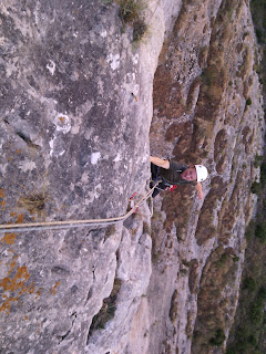 3er y 4º largo, ya hay prisa, decido empalmar largos y sin haber grandes dificultades en la progresión, se me vuelven a templar los bíceps, los tríceps, los cuádriceps y las molicies, con gran roce de cuerdas, pese a saltarme muchas chapas, barrunto la sensación de un buey arando un reseco patatal, a casi de 40º de temperatura, viendo el reposo del fresco manantial, ya próximo. Incómoda reunión que me deja sentado, con los pies suspendidos, sobre el desplome de salida de la Génesis, tirando de unas cuerdas que más parecen maromas de un fondeado barco.