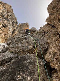 Despúes un tramo fácil hasta una repisa bajo un espolón. Continúo por este espolón, inicialmente con tendencia a los agujeros de la parte izquierda y después por la placa, con algún paso muy plantado. Despúes este espolón se a estrechando y acaba en una arista por la que continuamos unos metros hasta que a la derecha está la reunión.